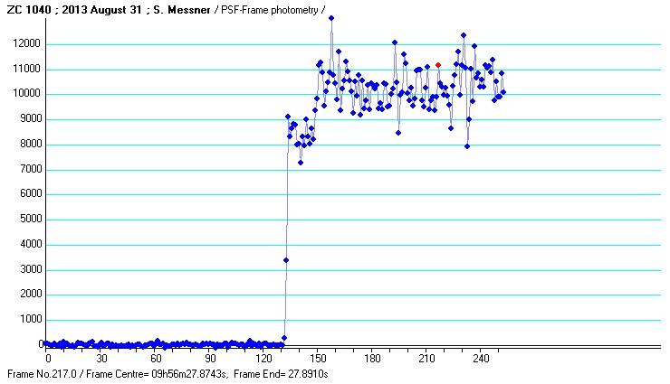 It was a good night. Got up about 3:45AM 8/31/2013CDT and timed about 20 total occultations over the next more than 2 hours. Two of these were known doubles but I had a nice suprise toward the end with a likely double star discovery of XZ93450! I was using my home made 18" newtonian at prime focus (F6) using a Watec 902H2 ultimate camera and IOTA-VTI.
