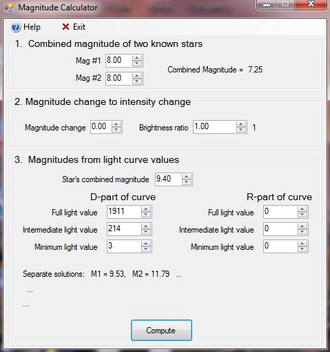 Guestimating the values for the faint star and the combined light of the two and knowing the combined magnitude for the two stars, using the Magnitude Calulator in Occult we can get the approximate magnitudes for the stars, 9.53 and 11.79