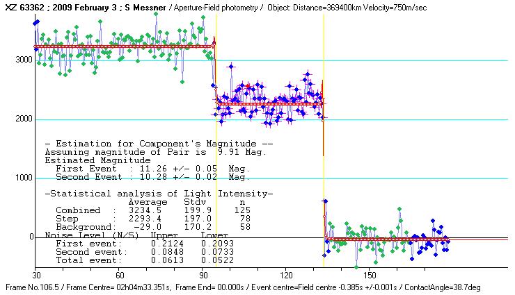 The light curve graph shows the steps as the stars disappear behind the Moon. With it we can get an approximate magnitude for the companion and if another observer or observers were capable of recording this event far from me at another position on the Moon limb a position angle for the two stars can be determined.