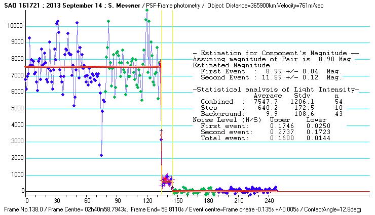 The light curve graph shows the steps as the stars dissapear behind the Moon. With it we can get an approximate magnitude for the companion and if another observer or observers were capable of recording this event far from me at another position on the Moon limb a position angle for the two stars can be determined.